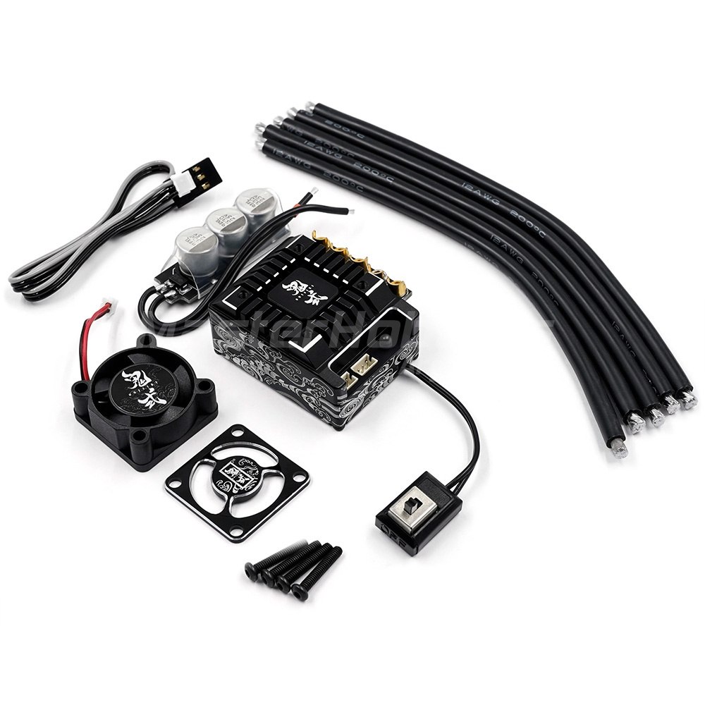 Onisiki Controlador de velocidad electrónico de deriva sin escobillas de 120 amperios. Este ESC es una excelente opción para aplicaciones de deriva RC debido a su suave respuesta del acelerador y sincronización ajustable. El ESC es capaz de 120A para mantener el rendimiento constante durante la carrera. Onisiki le dio a este ESC sus marcas distintivas para combinar mejor con los otros accesorios disponibles. El paquete incluye un ESC, cinco cables ESC, un ventilador, una cubierta de ventilador, un banco de capacitores, un cable receptor y hardware.