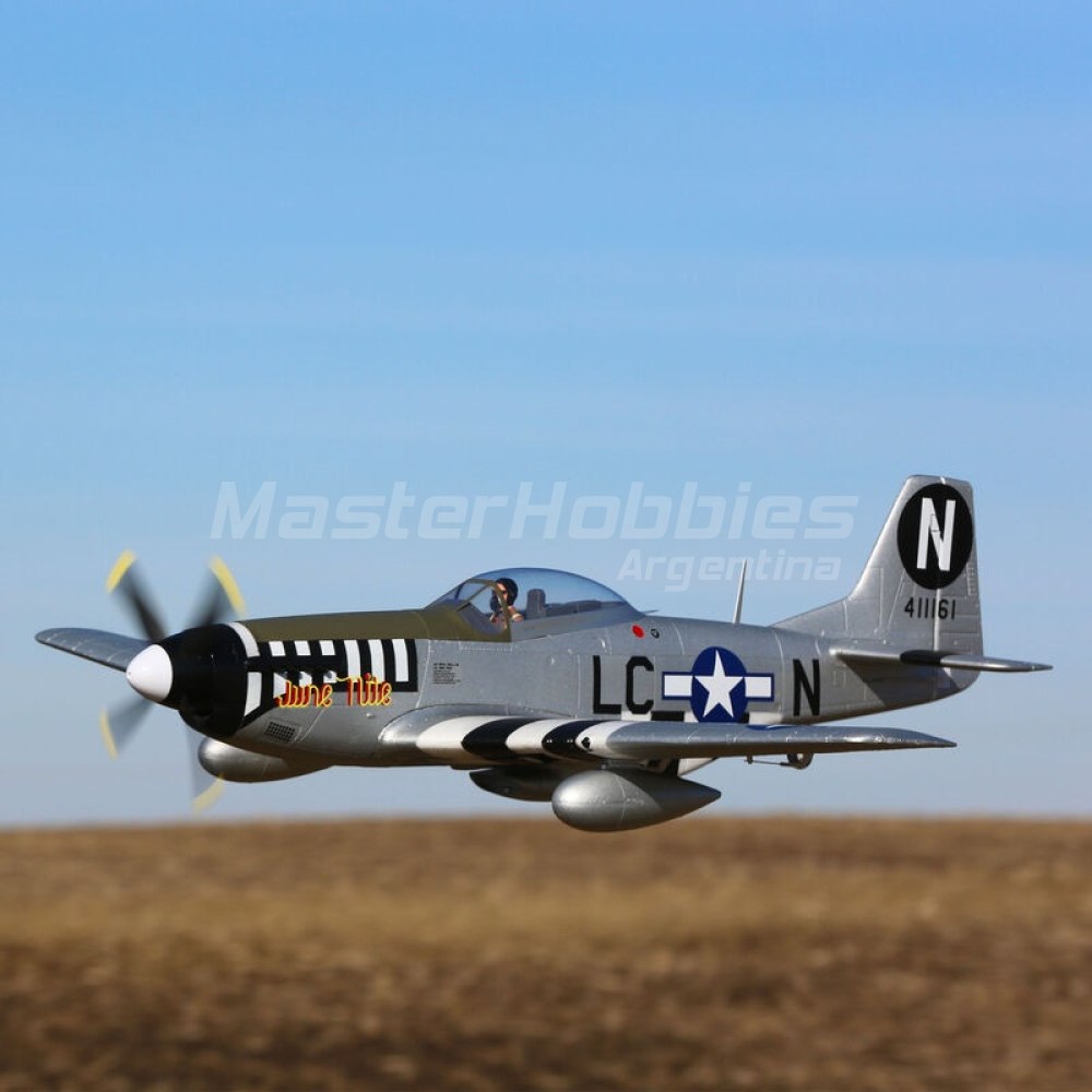Desde el principio, el prototipo de 1941 del P-51 fue impresionante. Sin embargo, las pruebas revelaron que la máquina súper elegante necesitaba cambios cruciales para convertirse en un verdadero pura sangre. La fórmula mágica se realizó con el P-51D que entregó el rendimiento, las armas y el alcance que los pilotos bien entrenados podían manejar para superar a cualquier retador del día. Incluso después de la Segunda Guerra Mundial, miles de Mustangs permanecieron en servicio con naciones orgullosas de todo el mundo, algunos hasta 1980. La réplica de 1,2 m del E-flite® P-51D Mustang captura un ejemplo máximo del legendario caza del Cuerpo Aéreo del Ejército de EE. el tipo de experiencia a escala que hace que volar con el caza más célebre de la historia sea más agradable que nunca.