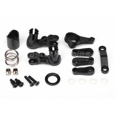 El juego de manivela acodada de dirección incluye manivela acodada, resorte protector de servo, retenedor de resorte, enlace de arrastre, bocinas de servo (3) y herrajes.
