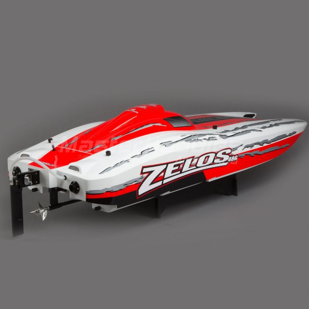 Corre como nunca antes con el catamarán Zelos ™ 48 Type G. Este catamarán de alta velocidad está equipado con un motor de gasolina Dynamite® Zenoah G300PUM de 30 cc refrigerado por agua capaz de alcanzar más de 50 millas por hora. En el momento en que la competencia sabe qué los golpeó; se comerán tu velatorio.