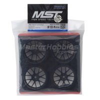 Este es un paquete de ruedas MST RE de 24 mm. Cada paquete incluye cuatro ruedas con compensación de +0. Estas ruedas cuentan con un patrón de radios divididos y detalles moldeados con cinco pernos de orejeta.